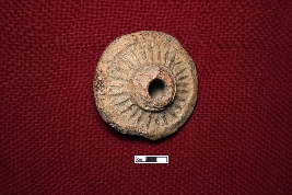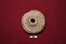 | Description / विवरण | A well-decorated red terracotta wheel from a toy cart, featuring a smooth surface. The central hub is thick and perforated. The surface of the wheel is adorned with a spoked design, with broken edges. |