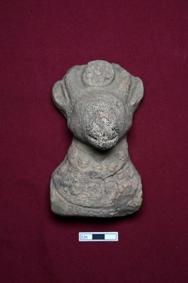 | Description / विवरण | This terracotta toy resembles a decorated animal figurine. The face is fully visible with a circular decoration on top of the head. The rest of the body is elaborately decorated with various designs. There is a perforation on the back. |