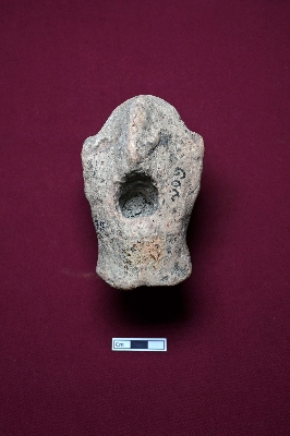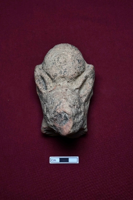 | Description / विवरण | This fragment of an animal figurine shows a damaged face, making it difficult to identify the animal. A circular, swollen part is positioned on top of the head, likely representing the upper part of a toy cart. A perforation is visible on the back. |