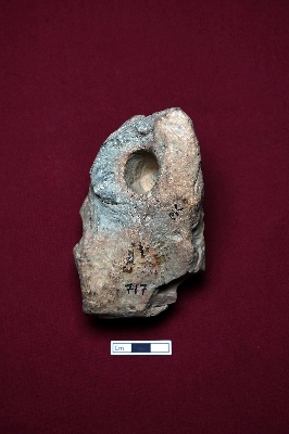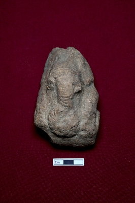 | Description / विवरण | This fragmented terracotta toy resembles an animal figurine. The face is partially visible with a circular decoration below it. A perforation is present on the back. |
