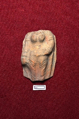 | Description / विवरण | A terracotta plaque displays a female figurine intact from neck to knee. Her left hand is placed below her navel, and her right hand is straight. Her hands are adorned with bracelets, and her legs are wrapped in folded cloth. |
