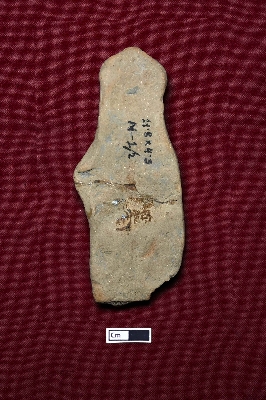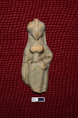 | Description / विवरण | A terracotta plaque shows a female figurine intact from the top to the lower knee. It wears a crown with three conical parts on top. The facial expression is not visible. The breasts are identifiable, and it has a narrow belly gradually widening towards the waist. The left hand is placed on the waist, and the right hand is straight. |