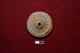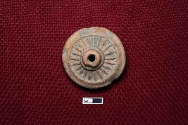 | Description / विवरण | A well-decorated red terracotta wheel from a toy cart, featuring a smooth surface. The central hub is thick and perforated. The wheel s surface is adorned with a spoked design, and it has broken edges. |