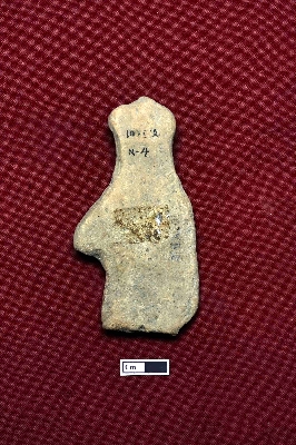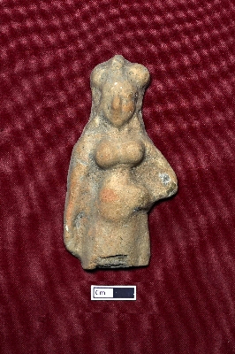 | Description / विवरण | This terracotta plaque depicts a female figurine intact from the top to the thigh. She wears a crown with three conical parts on top. The facial expression is partially visible. Her left hand rests on her waist, while her right hand is extended. A noticeable baby bump is present. |
