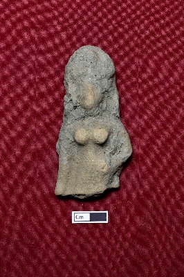 | Description / विवरण | This terracotta plaque features a female figurine intact from the top to the thigh. She wears a crown with three conical parts on top, though it is almost eroded. The facial expression is not visible. Her left hand rests on her belly, and her right hand is extended. |
