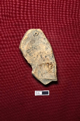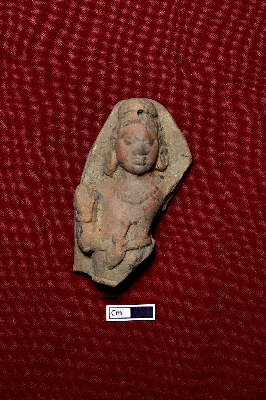 | Description / विवरण | This terracotta plaque depicts a male figurine adorned with a turban and large circular earrings. The eyes, nose, and lips are visible, and a necklace can be seen. The right hand is visible, while the left hand is missing. A dagger is securely tucked into the waist, suggesting the figure s possible role or status. A perforation is present at the top. |