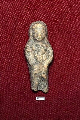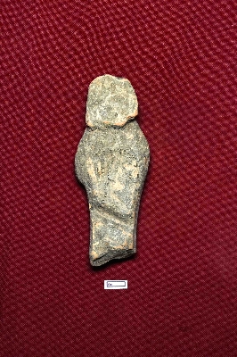 | Description / विवरण | This terracotta male figurine, in a standing posture and intact from the top to the thigh, has both hands positioned in front of the belly. The facial expression is not visible. |