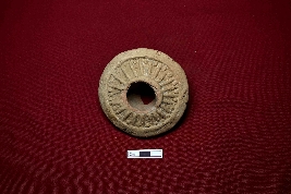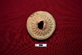 | Description / विवरण | A well decorated terracotta wheel of a toy cart which is red in colour with smooth surface. The central of the wheel is thick and perforated. The surface of the object is decorated with spoked design. |