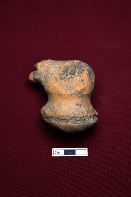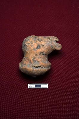 | Description / विवरण | This terracotta fragment represents the head of an animal, characterized by its red color and open jaw. The base is hemispherical, suggesting that this piece was once attached to another object. |
