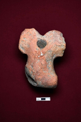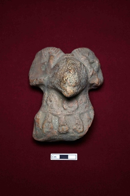 | Description / विवरण | This terracotta toy cart is look like a decorated animal figurine. The face is partly damaged, but the base is embellished with floral designs and the ear features intricate decorations. A channel at the bottom is designed for an axle to hold wheels, and a hole in the back suggests it was intended to be hung. |