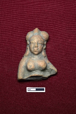 | Description / विवरण | This terracotta plaque depicts a female figurine from the top of the head down to just above the belly. She is adorned with a crown consisting of three conical elements. The facial expression is clear, and the breasts are identifiable. |