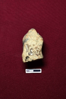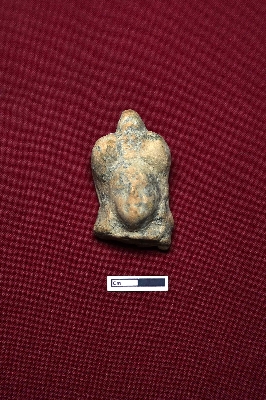| Description / विवरण | The terracotta head of a human figurine shows a slightly visible facial expression. Two bulbous objects are positioned on either side of the head, with a conical part on top. |