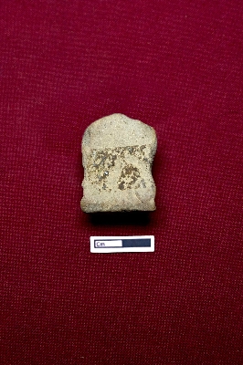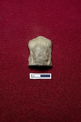 | Description / विवरण | The terracotta plaque depicts the face of a human figurine. The face is completely eroded, making it difficult to identify any features. A crown with three conical shapes is placed on top. |