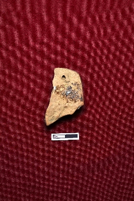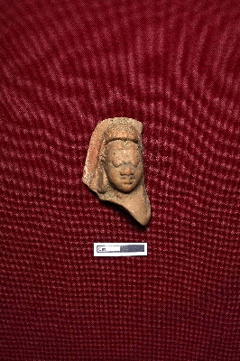 | Description / विवरण | A terracotta plaque depicts the face of a human figurine with a clearly visible frowning expression. The figurine has a flattened nose and a large circular earring on the right ear. A hemispherical-shaped cap is placed on top of the head. |