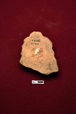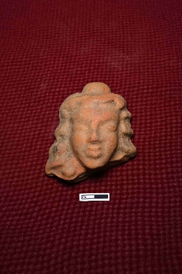 | Description / विवरण | A terracotta plaque depicts the face of a male figurine. The facial expression is fully visible, and the figure has decorated curly hair on either side of the face, with a hair knot on top of the head. |