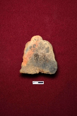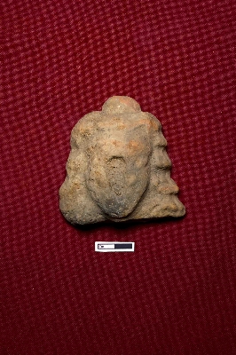 | Description / विवरण | A terracotta plaque shows the face of a male figurine. The facial expression is entirely damaged, though the figure has decorated curly hair on either side of the face, with a hair knot on top of the head. |