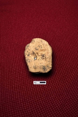 | Description / विवरण | A terracotta plaque displays the face of a human figurine. The facial expression is not visible, but three bulbous forms are depicted on top of the head. |