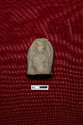 | Description / विवरण | A terracotta plaque features a human figurine intact from the top to the waist. Only the outline of the figure is recognizable; no other details can be identified. |