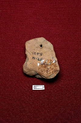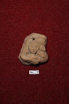 | Description / विवरण | A terracotta plaque shows the upper part of a female figurine. The facial expression is fully visible. On the left side, there are four thick hairpin-like objects, which are unusually large and indicative of crude craftsmanship. A large circular earring with a beaded design is depicted on the right ear, along with a decorated headband. There is also a perforation on top. |