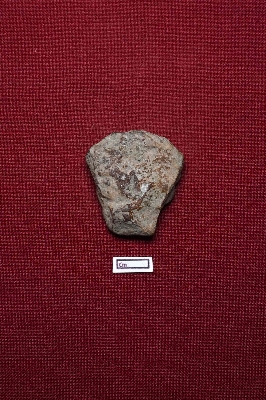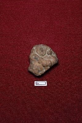 | Description / विवरण | A terracotta plaque depicts a fragmented male figurine, which appears to be a dwarf with a stout build. The left hand holds a sword-like object. The facial expression is visible, featuring a thick nose. There are two circular objects placed beside each ear. |