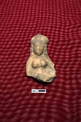 | Description / विवरण | A terracotta plaque showing a female figurine intact from the top to the lower breast. The facial expression is not visible, and a crown-like object is placed on top of her head. Her breasts are visible. |