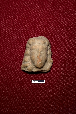 | Description / विवरण | A terracotta plaque showing the head of a human. The facial expression is partially visible, with hair styled in curls on both sides of the face. |