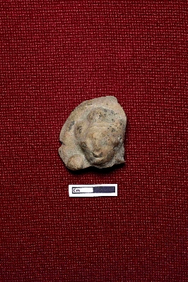 | Description / विवरण | A terracotta plaque depicting the head of a human figurine. The face is partially visible, and a crown with three bulbous sections is placed on top. |