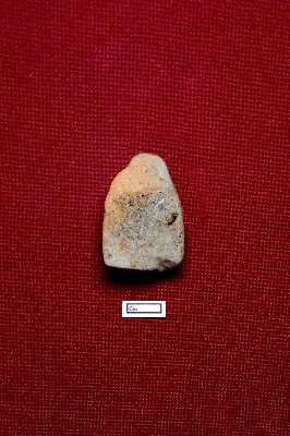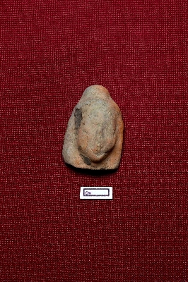 | Description / विवरण | A terracotta plaque showing the head of a human figurine. No facial expression is identifiable. A hair knot is placed on top. |