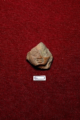 | Description / विवरण | A terracotta plaque showing the head of a human figurine, likely a female. The face is fully visible, although the left eye is missing. |