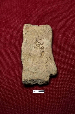 | Description / विवरण | A terracotta plaque showing a female figurine intact from the neck to the knee. The right hand is straight, and the left hand is bent and positioned at the left waist. |