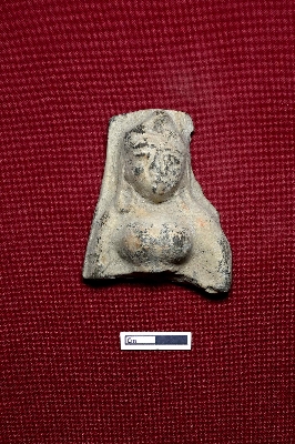| Description / विवरण | A broken terracotta plaque features a female figurine intact from the top to the lower breast. The facial expression is partly visible. A conical crown-like object is placed on top, and an elongated earring-like object is depicted in the right ear. |