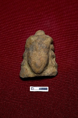 | Description / विवरण | A terracotta head of a human figurine. Facial expression is not visible. A hair knot is placed on top, with curls depicted on both sides of the face. |