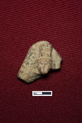 | Description / विवरण | A broken terracotta plaque showing the head of a male figurine. The object is adorned with a decorated tall beaver hat, and the facial expression is partly visible. |
