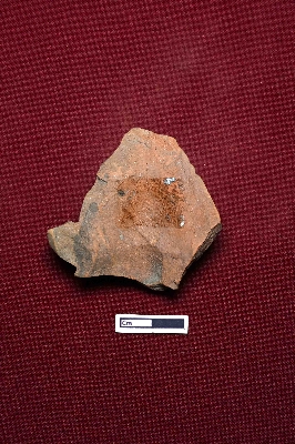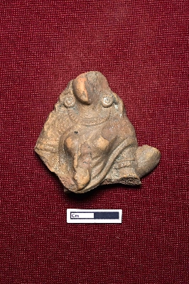 | Description / विवरण | A terracotta plaque showing a fragmented female figurine. The object is highly ornamented, with a decorated necklace and circular earrings depicted. The arms are adorned with decorated armlets, but the face is broken. |