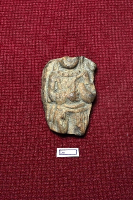 | Description / विवरण | A terracotta plaque shows a decorated male figurine, characterized as a dwarf. The figurine is adorned with a necklace and a circular earring on the right side. The right hand is bent and positioned in front of the chest, while the left palm is missing. |
