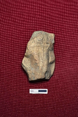 | Description / विवरण | A terracotta plaque depicts a broken human figurine. The left palm is placed on the waist, and the lower part is wrapped in folded cloth. A circular design is shown above the belly. |