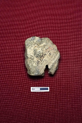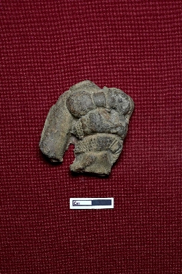 | Description / विवरण | A terracotta plaque features a broken human figurine intact from the breast to the belly. The belly is narrow, and the figurine appears to be wearing a shield-like object on the body. The right hand is partially broken. |