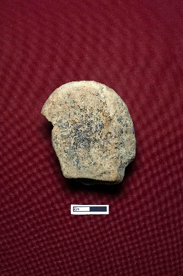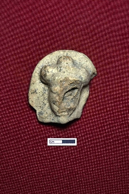 | Description / विवरण | A terracotta plaque showing the head of a human figurine. The facial expression is not visible, but a crown with three bulbous parts is placed on top. |