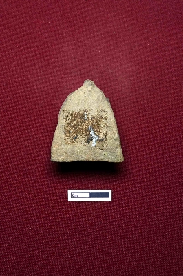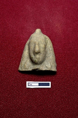 | Description / विवरण | A terracotta plaque depicting the head of a human figurine. The facial expression is partially visible, with a hair knot placed on top. |