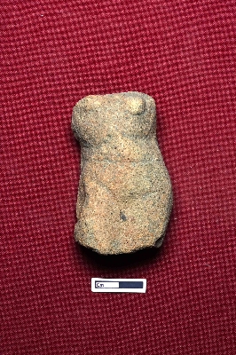 | Description / विवरण | A terracotta plaque shows a female torso. The object is red and has a rough surface. Only the left breast is visible. |