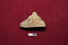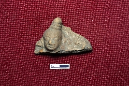 | Description / विवरण | A terracotta plaque features the face of a male figurine. A three-tier conical shape crown is placed on his head. The face is fully visible, though the nose is partly broken, and only the right ear is discernible. |