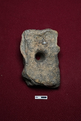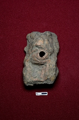 | Description / विवरण | The terracotta toy resembles an animal figurine, but the face is completely damaged. A perforation is visible on the surface. |