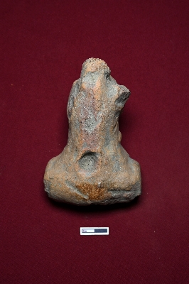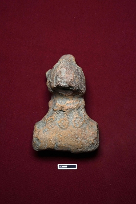| Description / विवरण | The terracotta toy resembles a decorated animal figurine, though the face is completely damaged. The upper part of the body is adorned with designs, and a hole for hanging purposes is visible on the backside. |