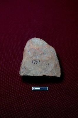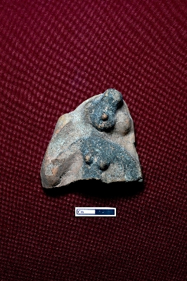 | Description / विवरण | A fragmented terracotta plaque featuring a female figurine. The object is intact from the top to the belly, with a headgear-like object placed on top. The breasts are visible, but the rest is broken. |