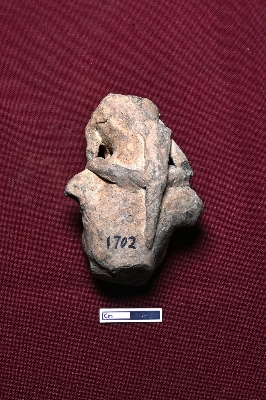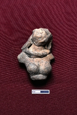 | Description / विवरण | A terracotta fragmented female figurine, showing only the head and breasts. A robe is attached around the neck, but the face is not visible. A ponytail is positioned at the back, crossing over the robe. |