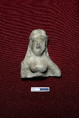 | Description / विवरण | A terracotta plaque depicting a female figurine, intact from the top to the lower breasts. A rounded cap-like object is placed on top, with the face partially visible. The figure is adorned with circular earrings. |