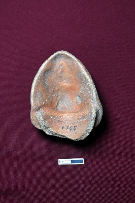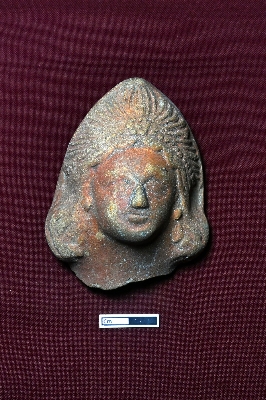 | Description / विवरण | A terracotta plaque showcasing the head of a female figurine, adorned with a decorative crown and earrings. The facial expression is fully visible. |