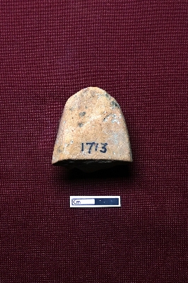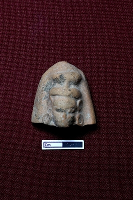 | Description / विवरण | A terracotta plaque showcasing the face of a human figurine, topped with a double-tiered crown. The facial expression is not clearly visible, but earrings are depicted. |