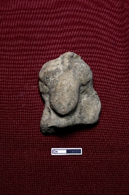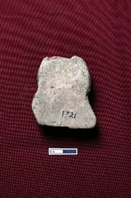 | Description / विवरण | A terracotta plaque showcasing the head of a human figurine, with the facial expression not visible. |