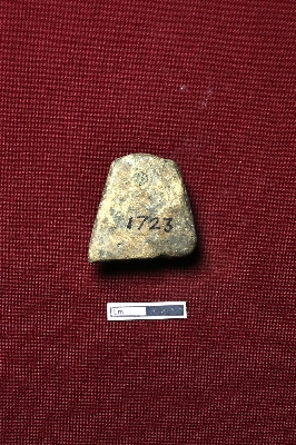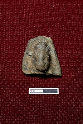 | Description / विवरण | A terracotta plaque displaying the head of a human figurine, with a crown-like object present. The facial expression is not visible. |